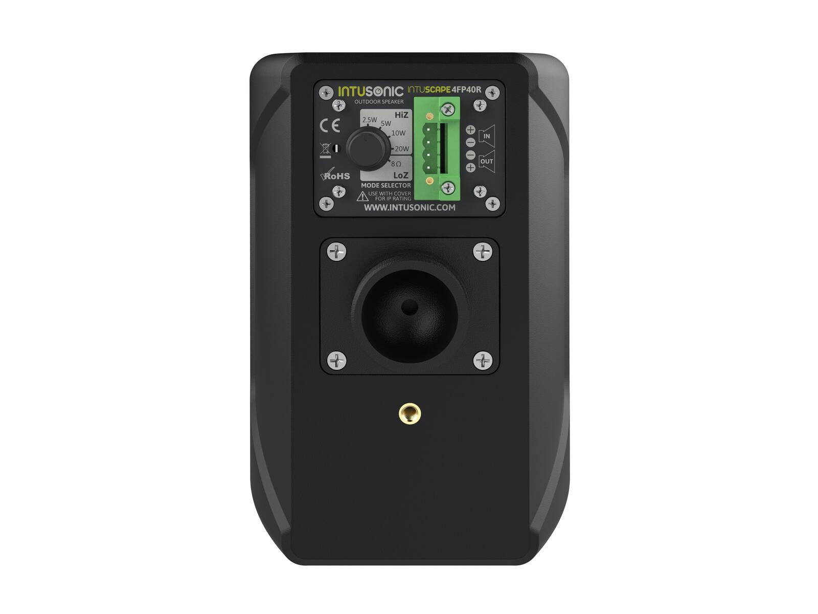 The INTUSCAPE 4FP40R is the most compact choice to bring background music to any venue’s outdoor areas. Its one-shell design from impact-proof ABS resin with a recessed baffle insert provides superior protection against rain. A PP cone woofer and a silk dome tweeter likewise withstand the rigors of outdoor use. Nonetheless, the vented design and the controlled dispersion deliver a pristine sound quality. An internal line transformer with switchable load, a real crossover – not just a capacitor – and our unique cable gland cover as well as the ball head bracket complement the elegant looks of this speaker.